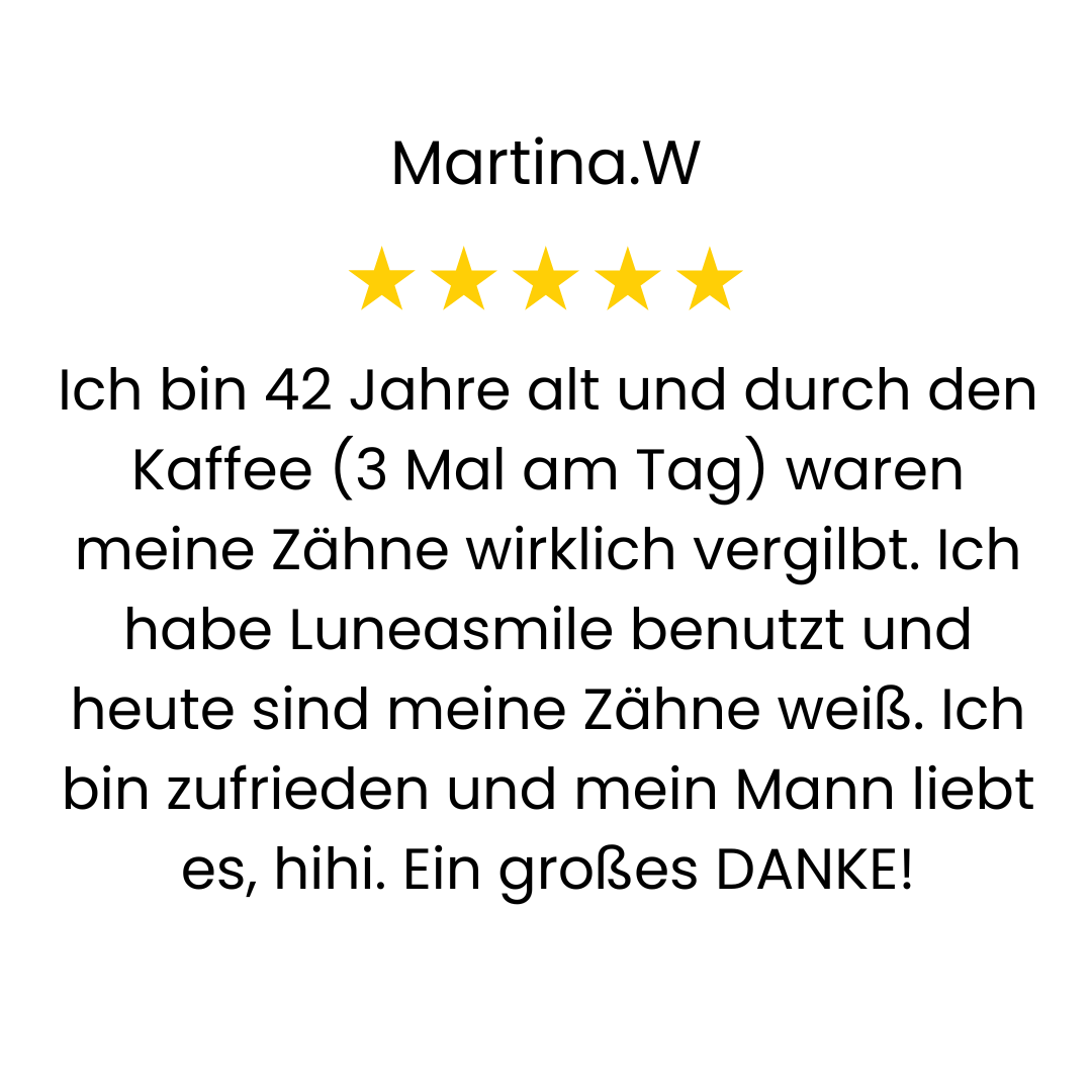 👉 Wenn Ihre Zähne jedoch seit vielen Jahren durch Kaffee, Tee, Tabak oder Wein verfärbt sind, empfiehlt es sich, LUNEASMILE™ über einen Zeitraum von mindestens 3 bis 4 Monaten anzuwenden, um ein strahlendes und dauerhaftes Lächeln zu erzielen.